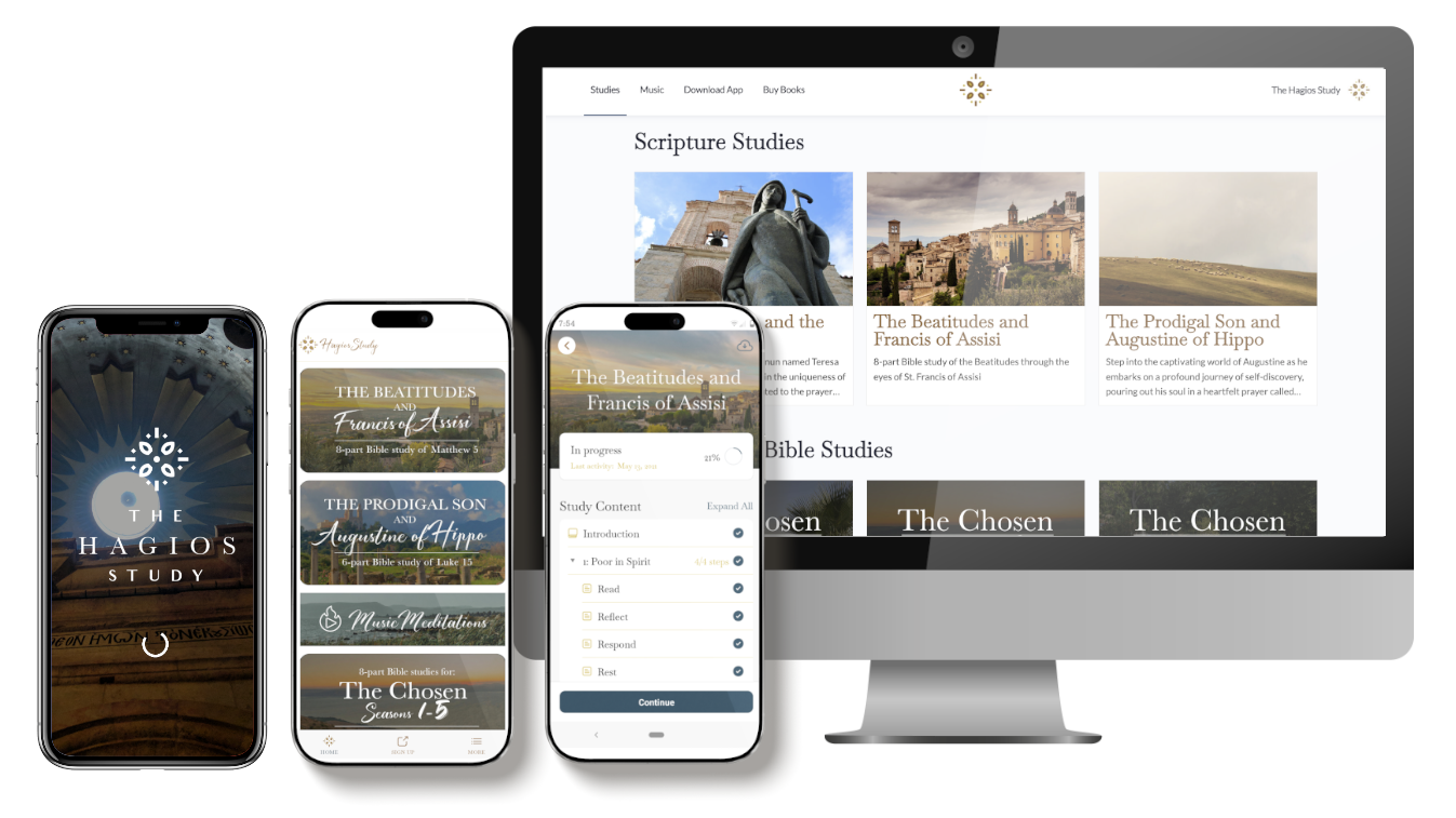 Enhance your study with custom music video meditations for reflection and rest. Meditate with custom instrumental music, exclusively created by The Vigil Project for The Hagios Study. In the Rest meditations, experience deeper impact from your week of study through a contemporary Christian music song that applies to the theme of the week. Each Reflect mediation features the key scripture verses from that week. Each verse shares a keyword highlighted in gold from the main verse of the section, furthering our understanding.